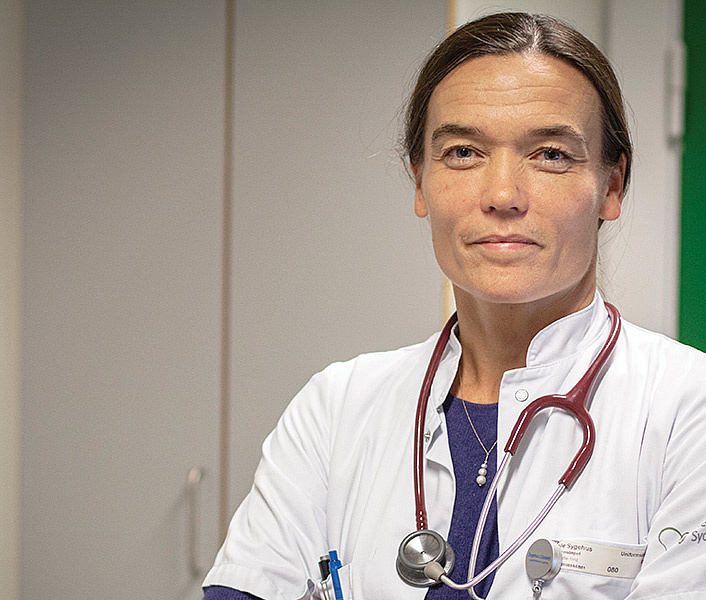 »For eksempel kan det være svært at smertedække en patient, som er bange eller har nogle svære relationer. Hvis vi kan hjælpe patienten med nogle af disse sociale og følelsesmæssige forhold, så kan vi også bedre lindre de fysiske smerter. Derfor bruger jeg en del af min tid på at tale med patienterne og finde ud af, hvad der fylder hos dem. Jeg snakker ikke ret meget med patienter om tro, men de må gerne vide, at de også kan sige til mig, hvis de er bange for at dø eller for, hvad der skal ske bagefter,« siger hun.