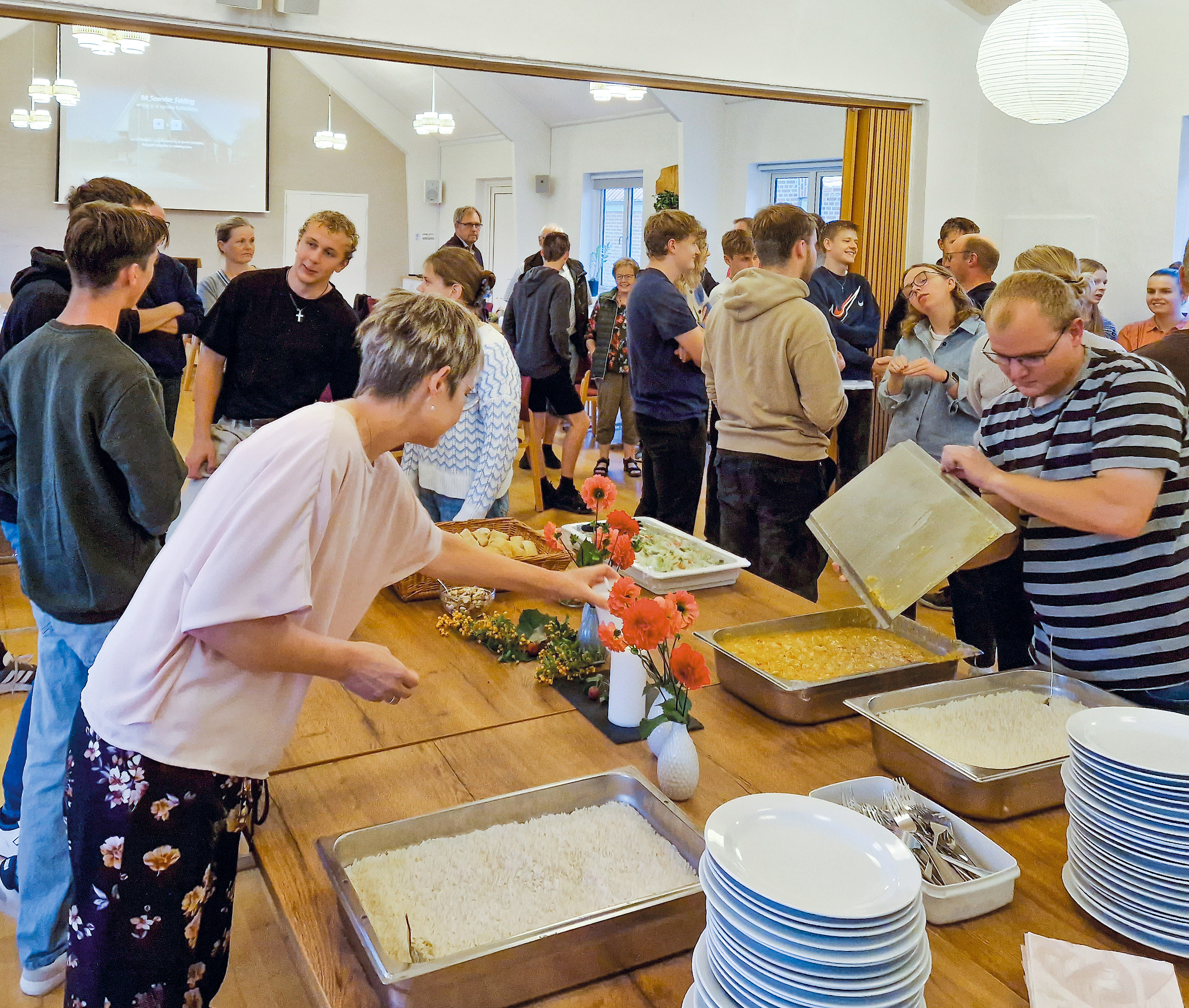 Aftenen begynder med fællesspisning, og efter at luften har været fyldt af goddag og velkommen, så kaster alle sig over maden, og snakken går lystigt. Aftenens mødeleder, Valdemar Søndergård, står lidt i baggrunden og nyder sceneriet: »Det er første gang, at vi er så mange til spisning. Det giver mig gåsehud,« siger han.