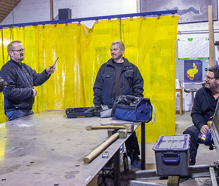 Den første tirsdag i maj rumsterer tre mænd i værkstedet. Peter Fredgaard fra Aulum har kørt sin trailer ind i værkstedet og er i gang med at fikse parkeringslyset. Thomas Bøndergaard fra Astrup er i gang med at lave en ny, specialdesignet pandekagemaskine, som måske kommer i brug på Familiecamping 2 på Mørkholt Strand Camping. Mikael assisterer Thomas med forskellige svejseopgaver.