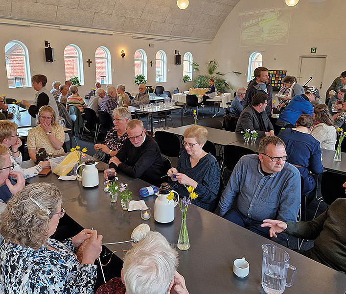 »Her kommer der nogen, som jeg ikke kender,« fortæller en ældre dame og ser hen på en yngre børnefamilie. Hvortil en lille pige, der sidder på skødet hos nabodamen, siger lige ud: »Så må du lære dem at kende.« Svaret får smilene frem, og det tager tid at tælle alle de glade ansigter i missionshuset.