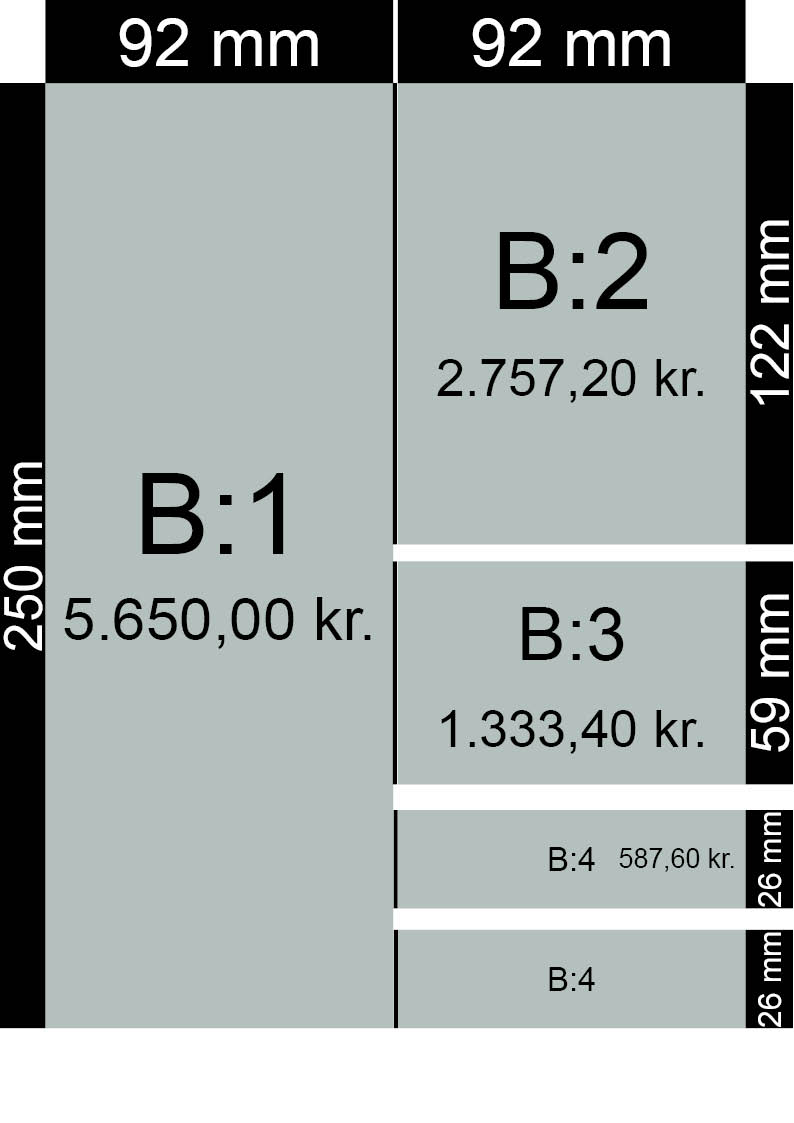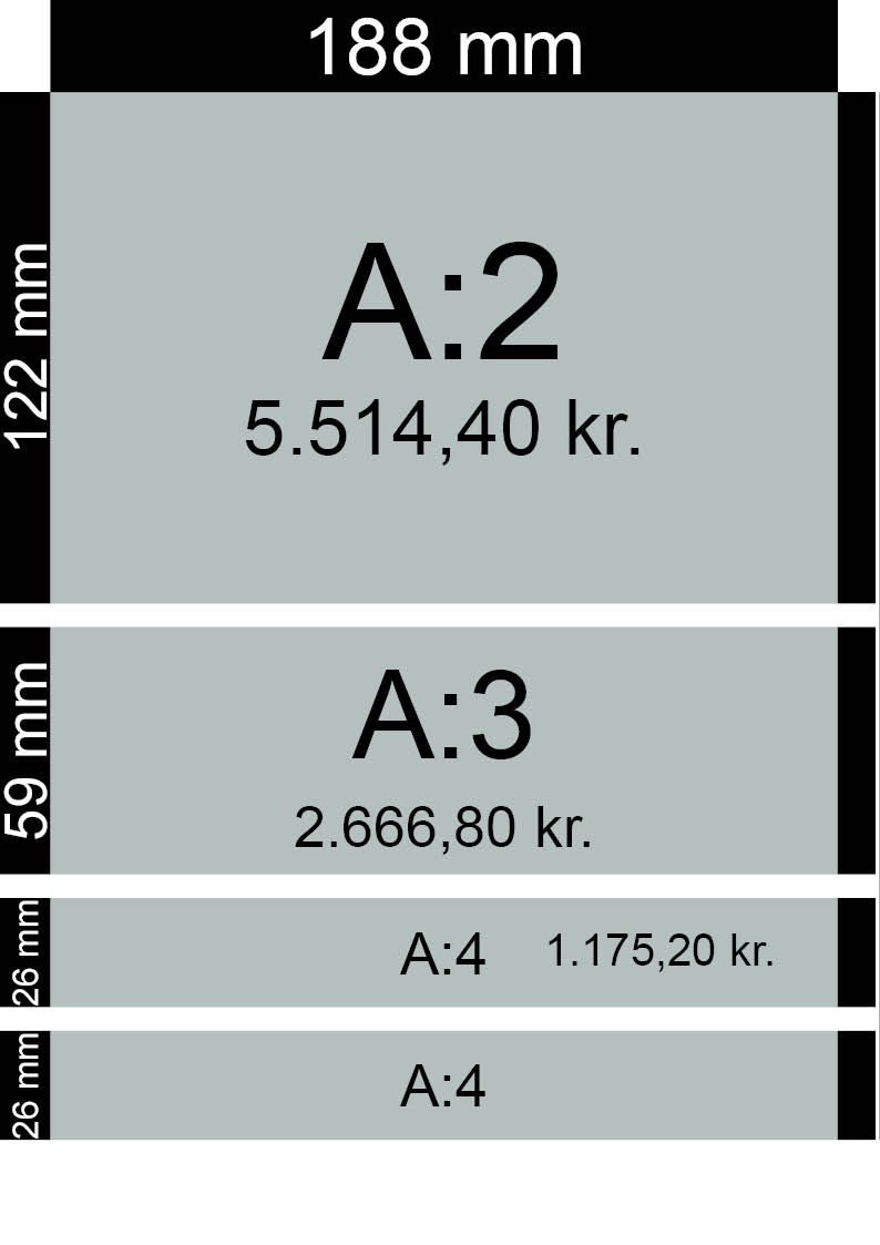 Vi tilbyder rubrikannoncer med en fast bredde og højde. Se formater og priser her: