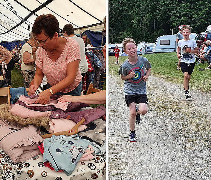 Flere af deltagerne havde medbragt boder, hvorfra der blev solgt tøj, legetøj, træskærerarbejde og meget andet, da Lystruphave Bibelcamping holdt markedsdag. Desuden kunne deltagerne købe nybagte vafler, mens de ventede på sponsorløbet, hvor børn og voksne skulle løbe så mange omgange som muligt i løbet af en halv time på en 450 meter lang rundstrækning. Pengene gik i år til nye stole i mødeteltet.