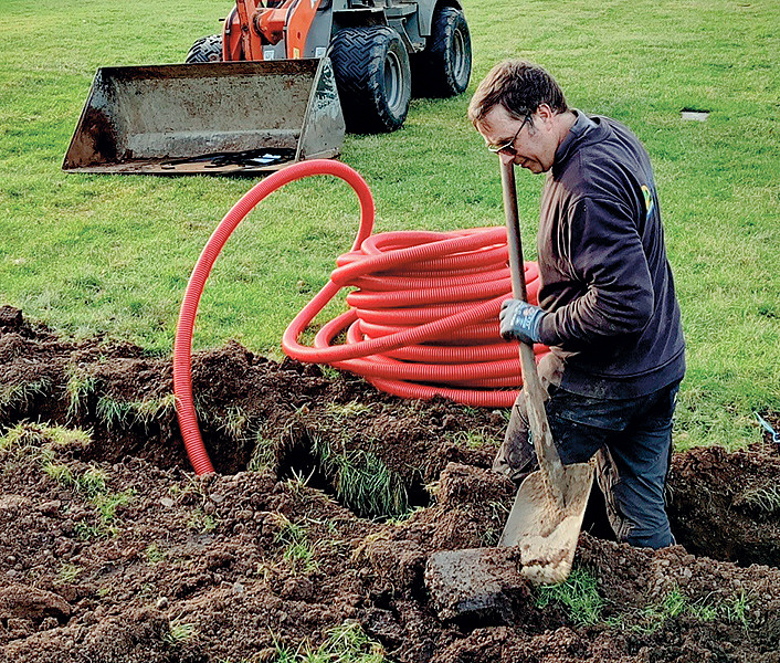 Så snart frosten slap jorden, gik pladsmand Jan Solgaard i februar i gang med at grave render til en udbygning af campingpladsens fibernet. De nye kabler skal forbinde fem nye mobilmaster med de eksisterende og dermed sikre en stabil internetforbindelse til hele campingpladsen ved Vejle Fjord.