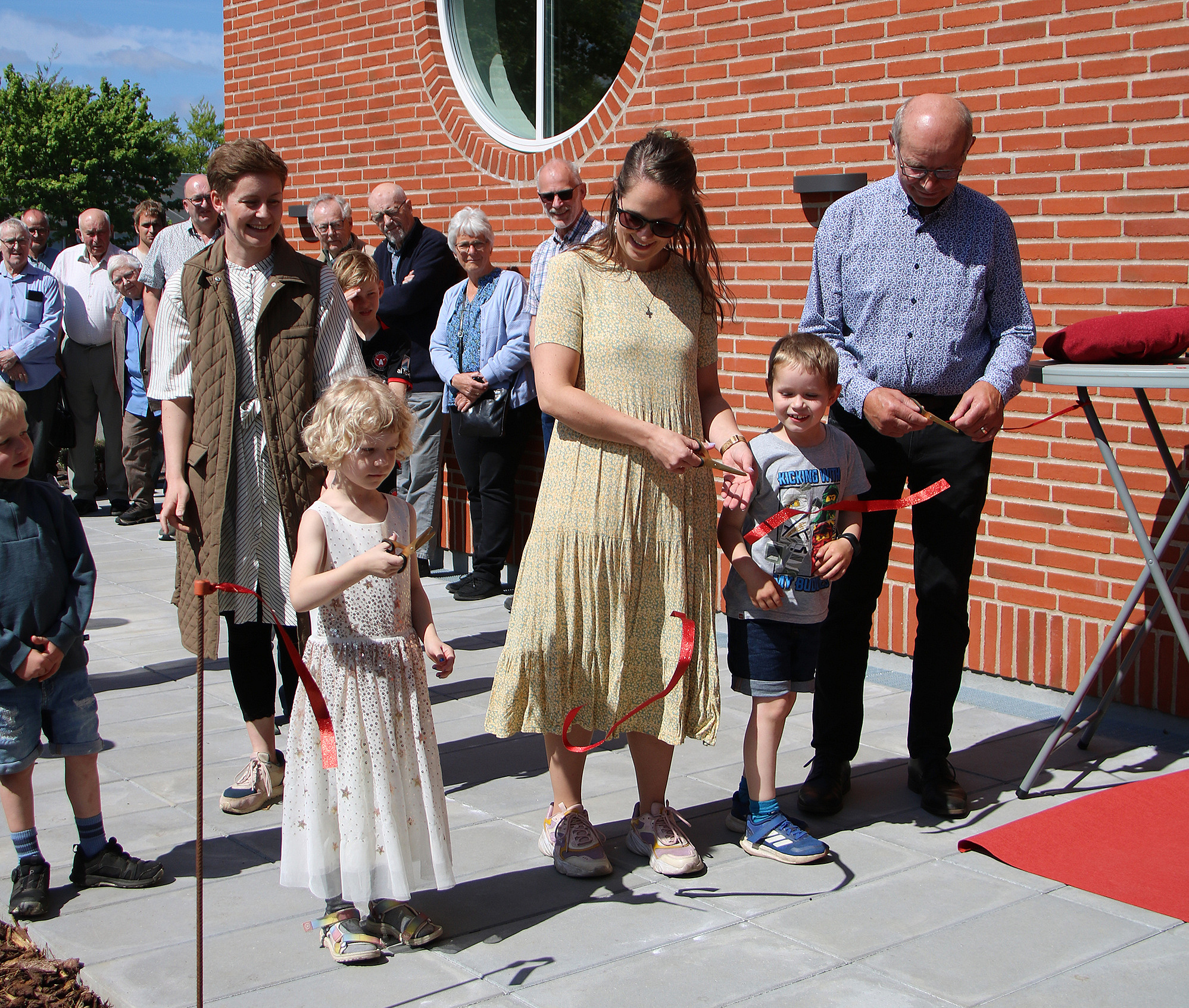Line Reckweg Nissen, der er formand for Indre Mission i Gludsted, byder velkommen og forklarer, at det er tre generationer, der skal klippe den røde snor med guldsakse.
