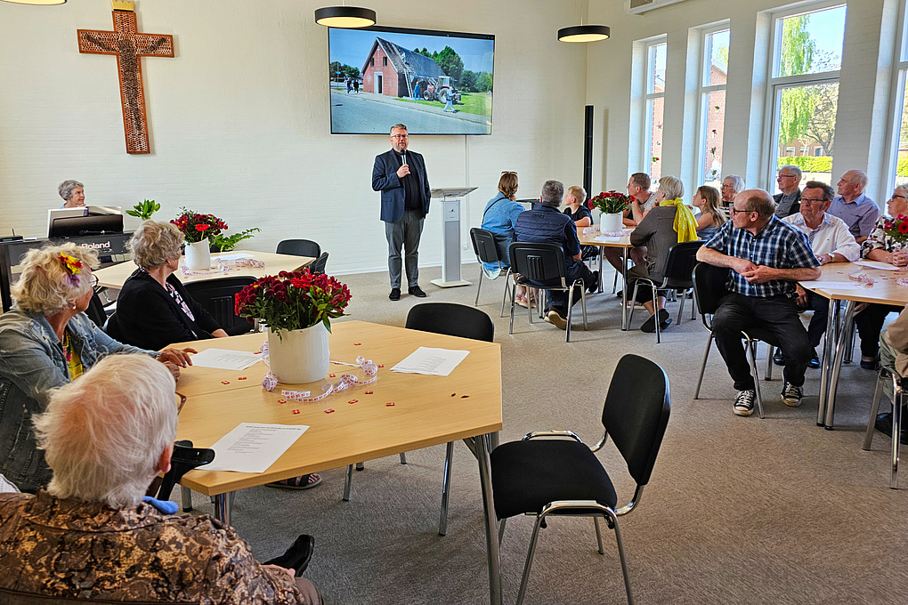 Efter snorklipningen myldrer folk ind i det nye missionshus. Tina Andersen fra Landsbyforeningen for Gludsted og omegn hører IM’s formand Hans-Ole Bækgaard indvie missionshuset, og inden hun tager for sig af lækkerierne på kagebordet, fortæller hun: