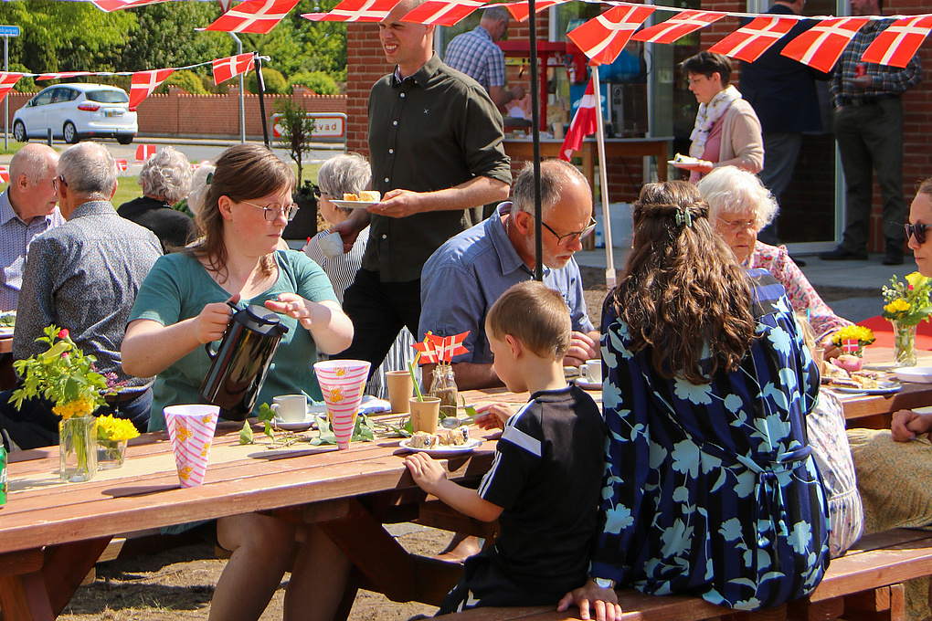 Flere af den nærliggende skoles bænkesæt er stillet op i solen, pyntet med flag og blomster. Gæsterne har sat sig med kaffe og kage, og snakken går lystigt omkring bordene. Bagerst i området er der stillet to hoppeborge op, som børnene boltrer sig i. Den ene hoppeborg og en mængde legesager har Danmark Folkekirkelige Søndagsskoler sørget for, fordi de er hyret ind til lejligheden.