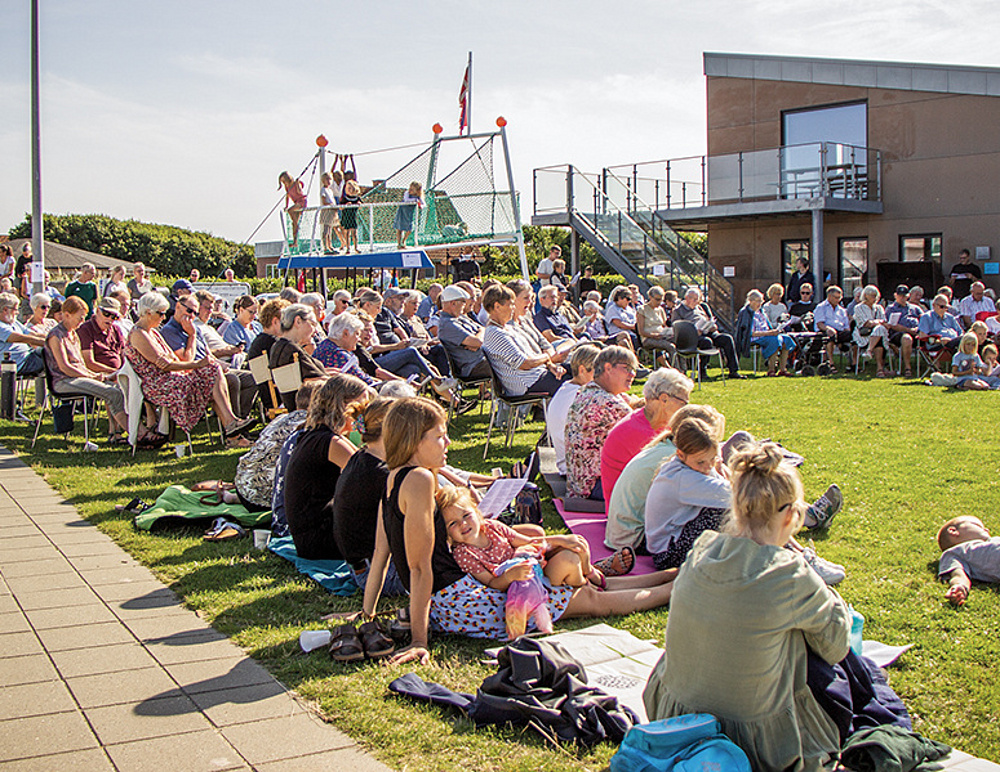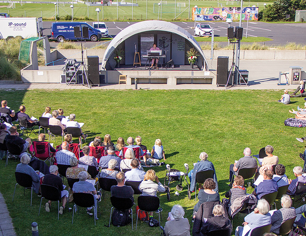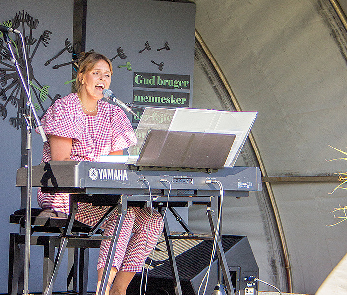 Det bliver til halvanden times fællessang, og folk hygger sig gevaldigt. Nogle har medbragt campingstole med kopholder til kaffen, andre sidder på tæpper. Nogle forældre har fundet en plads ved missionshusets legeplads, så de kan holde øje med børnene. De løber rundt og leger, mens Katrine synger.
