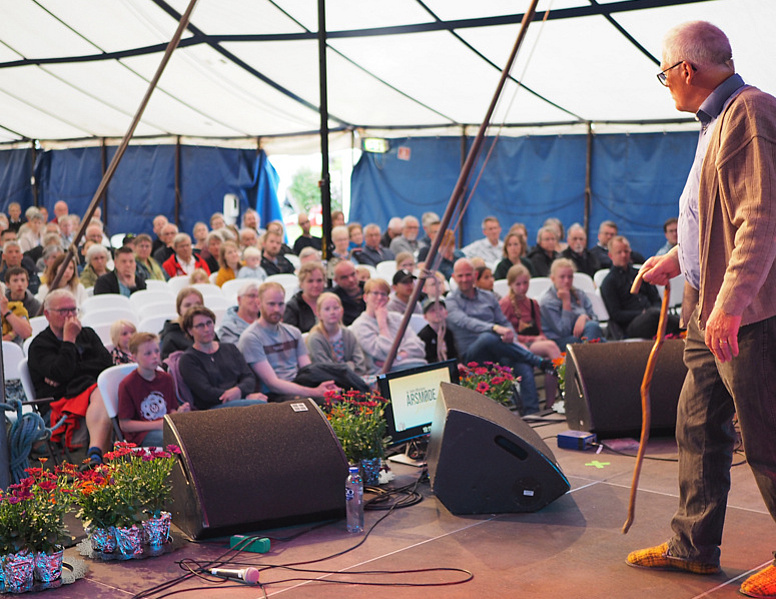 På scenen bød generalsekretær Jens Medom Madsen og landsleder i IM-musik Linda Kofoed Iversen velkommen, og der blev sunget godt med, da teltet derefter fyldtes af Jubler hver en sjæl på jord. Rækken af parkerede barnevogne langs siden af teltet vidnede om, at de yngste også var til stede i teltet denne aften. Og netop børnene kunne se frem til en sjov aften, hvor først Svend Erik Petersen i skikkelse af »bedstefar Svenne« indtog scenen med bibelfortælling og kanonsang, som han ivrigt dirigerede med sin stok.