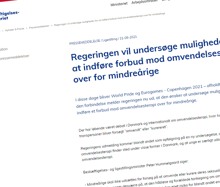 Ligestillingsministeriet bestilte i 2020 en rapport, der skulle samle viden om omvendelsesterapi i Danmark. Rapporten udkom 21. august og konkluderer, at der i dag ikke kan findes eksempler på »terapilignende forløb, der har til formål at ‘kurere’ eller ændre homoseksuelle personers seksuelle orientering.«