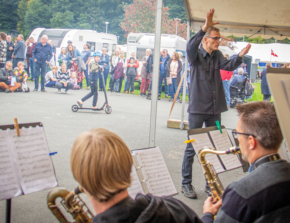 Det blev dog taget med godt humør. Glæden over at være mange sammen overstrålede også irritationen over, at kaffen slap op, og at de tre pattegrise knapt var grillet færdige, da bordverset var sunget. Det fik blot campingchef Ole Korsholm Nielsen til at gribe en guitar, og så var der stående fællessang i køen, indtil grisene var møre som smør.